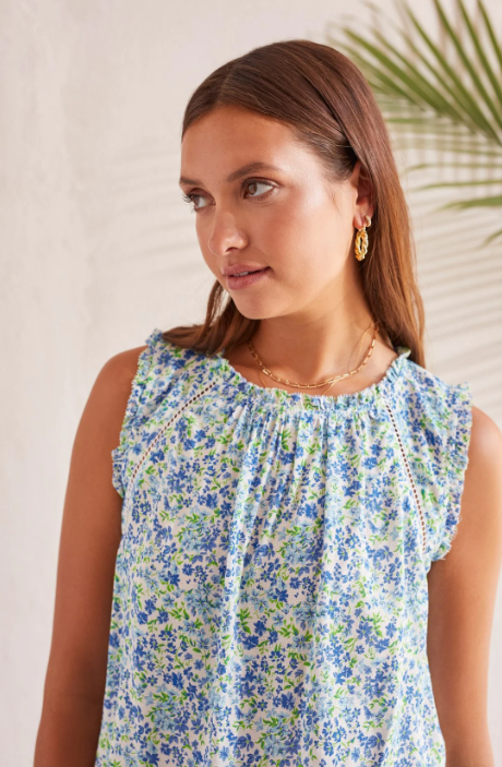 PRINTED SLEEVELESS BLOUSE WITH CROCHET TRIM